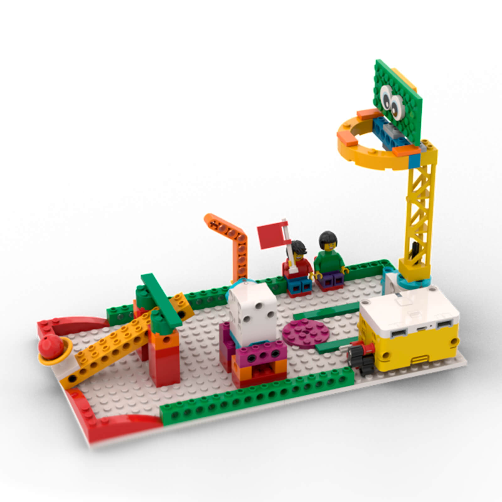 La cancha de baloncesto se construye a partir del kit educativo Lego Spike Essential. Un motor accionará el lanzador de balones mientras otro motor hace girar la pelota. El girosensor del bloque nos permitirá decidir cuando lanzamos.